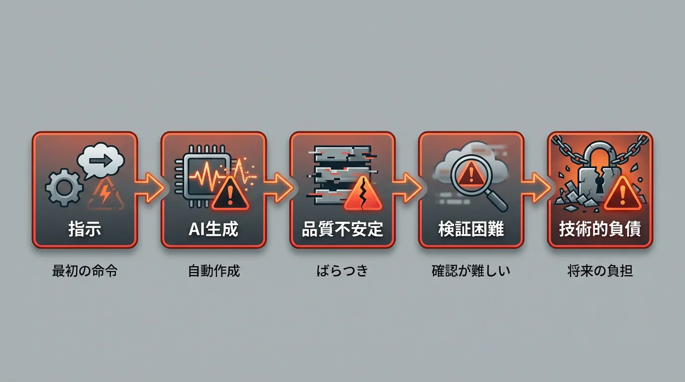- 技術的負債の蓄積:AIが生成したコードを検証せずに積み重ねると、後で修正が困難になる