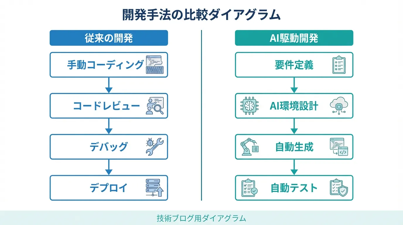 従来の開発では、エンジニアが要件を理解し、自らコードを書き、テストを行い、デプロイするという一連のプロセスを担ってきました。しかしAI駆動開発では、この流れが根本から変わります。