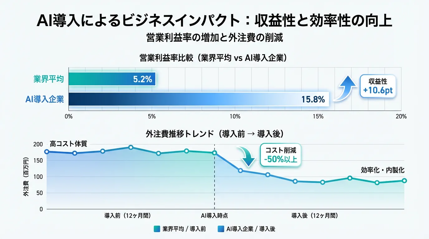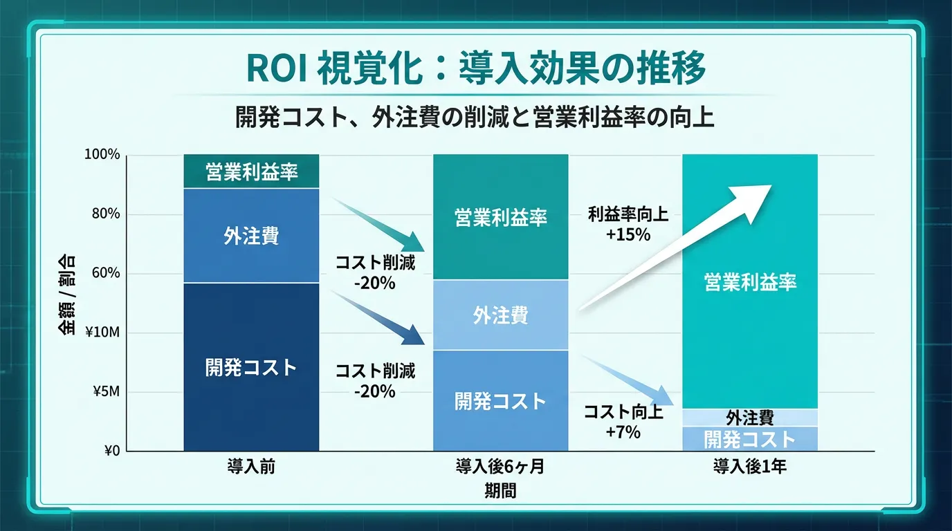 野村総研の事例では、AI駆動開発の導入により外注費が大幅に削減され、結果として営業利益率が業界平均の約2倍に向上しました。