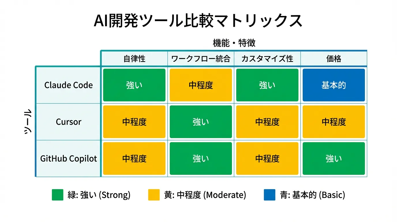 AI駆動開発を実現するツールは複数存在しますが、その中でも特に注目されているのが、Claude Code、Cursor、GitHub Copilotの3つです。それぞれ異なる強みを持ち、開発チームのニーズに応じて選択すべきツールが変わります。