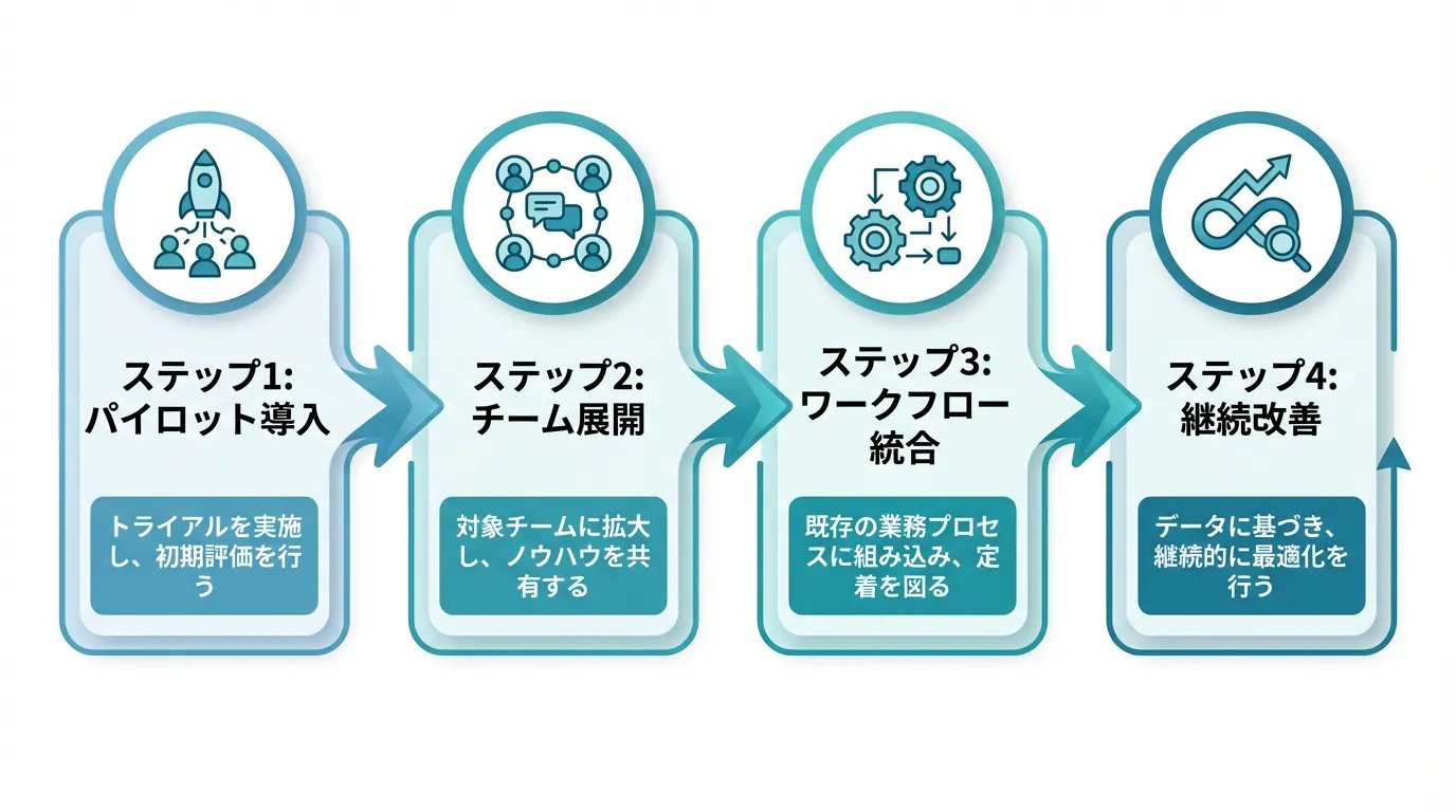 AI駆動開発を組織に導入する際は、段階的なアプローチが成功の鍵となります。以下の4段階プロセスを参考にしてください。