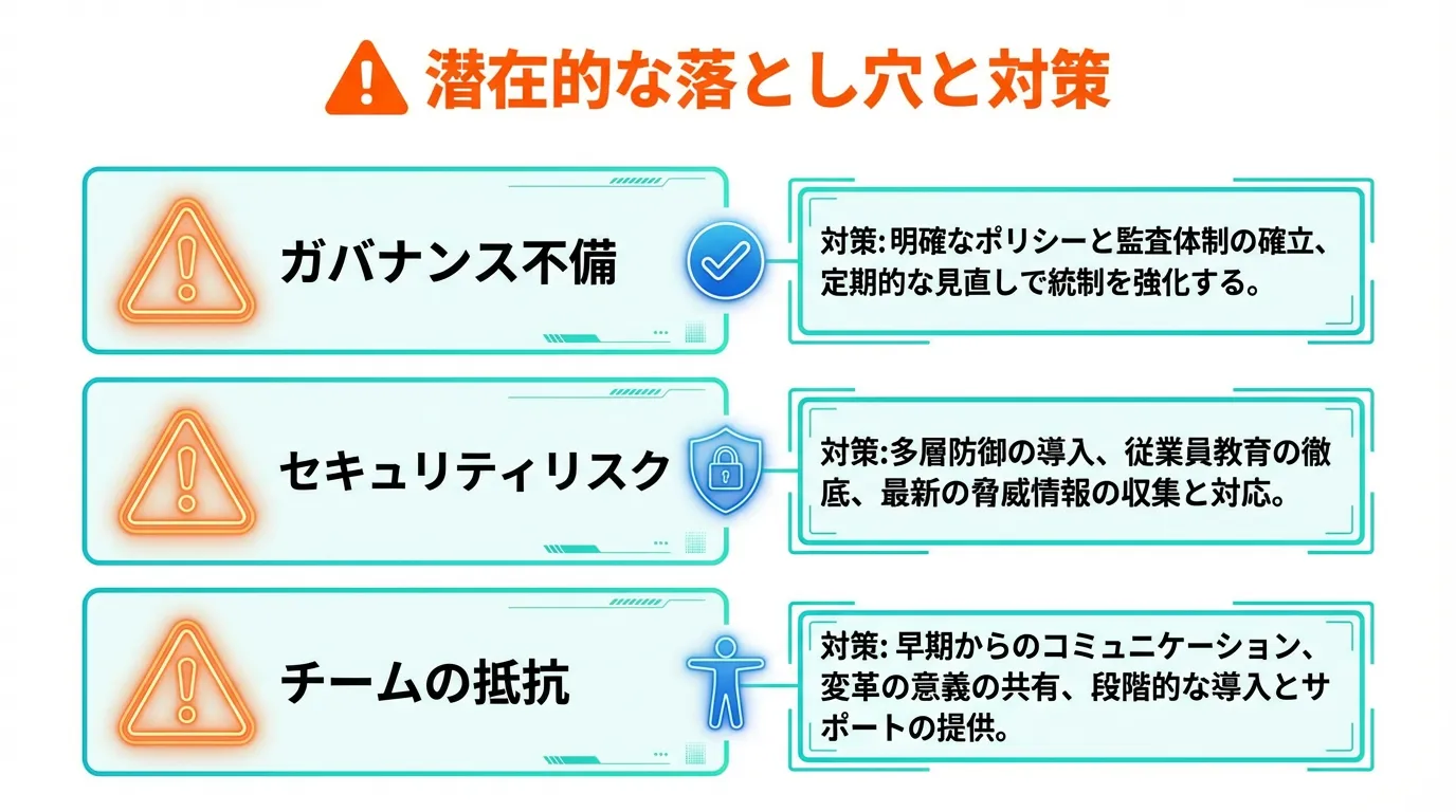 AI駆動開発には大きなメリットがある一方で、導入時には注意すべき落とし穴も存在します。以下のポイントを押さえることで、失敗リスクを最小化できます。