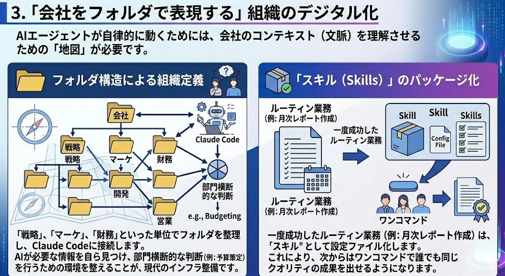 - フォルダ構造による組織定義: 「戦略」「マーケ」「財務」といった単位でフォルダを整理し、Claude Codeに接続します。AIが必要な情報を自ら見つけ、部門横断的な判断(例:予算策定)を行うための環境を整えることが、現代のインフラ整備です。