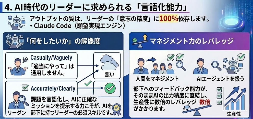 Claude Codeは、いわば「願望実現エンジン」です。アウトプットの質は、リーダーの「意志の精度」に100%依存します。