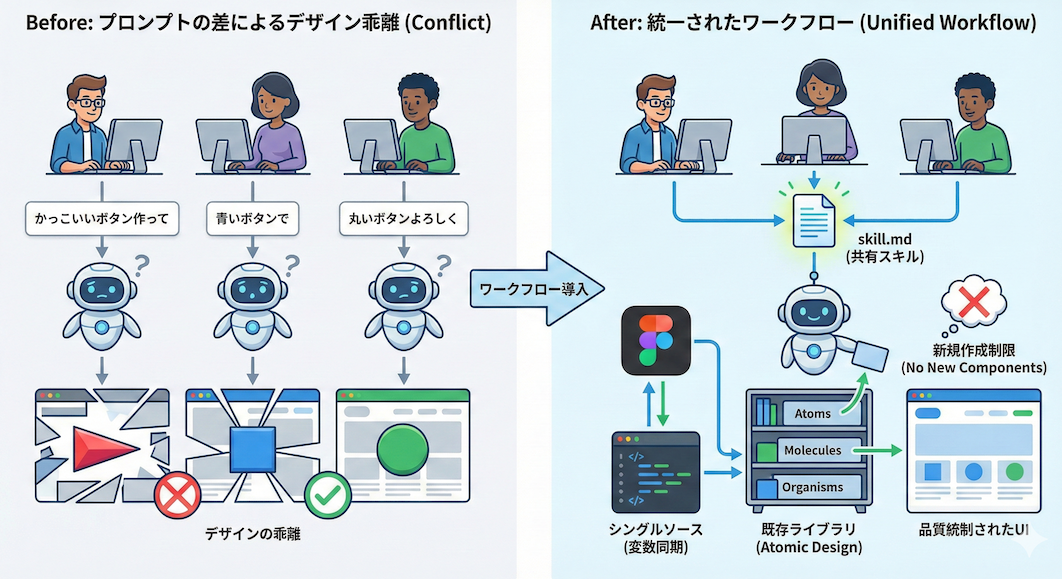AI駆動の開発をチームで行う際、最大の敵は「各メンバーのプロンプトの差によるデザインの乖離」です。これを防ぐために、以下のワークフローが提案されました。