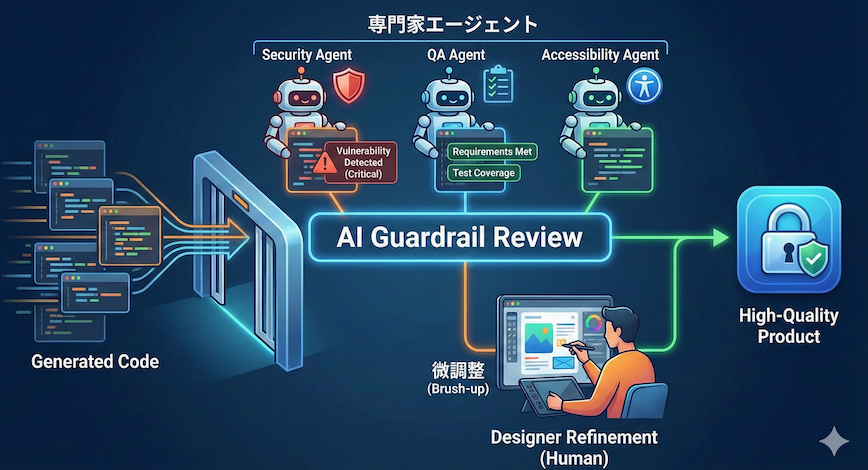 生成して終わりではありません。議論では、セキュリティ、QA(品質保証)、アクセシビリティなど、10種類以上の「専門家エージェント」による自動レビューの重要性も語られました。