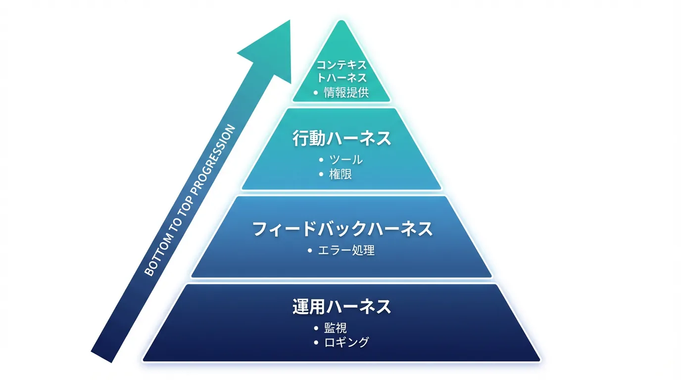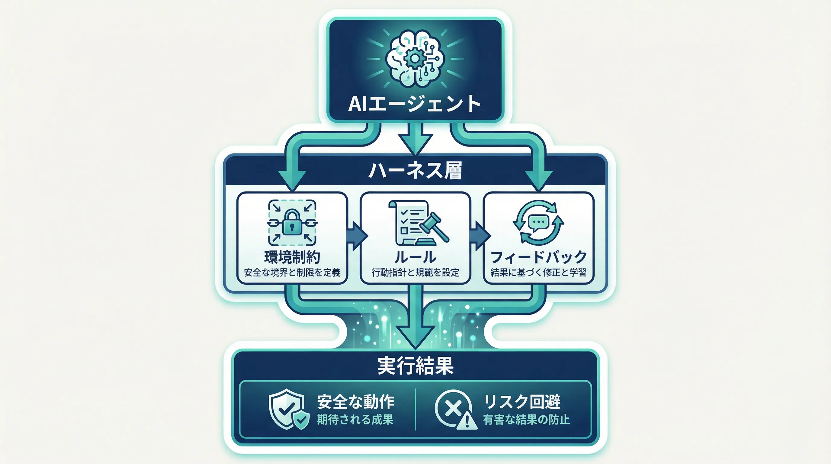 - ハーネスエンジニアリング:AIが実行できる行動の範囲、ツールへのアクセス権限、フィードバックループの構造など、実行環境全体を設計する