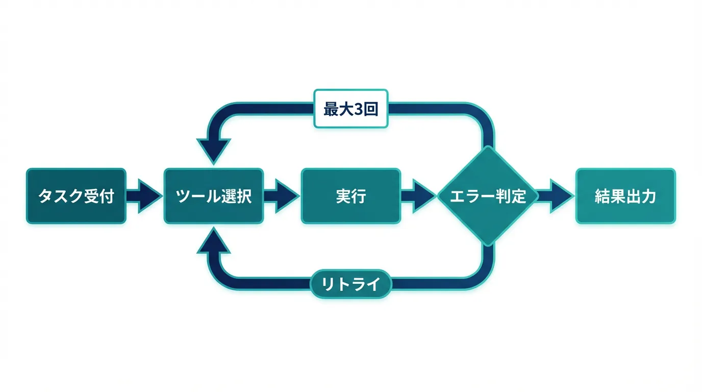 従来は固定回数(例: 3回)のリトライでしたが、改善後はタスクの複雑度に応じて試行回数を動的に変更するようにしました。