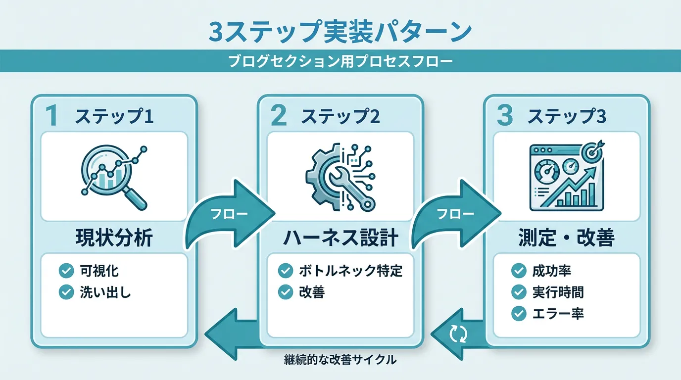 ハーネスエンジニアリングは、大規模な開発体制でなくても導入できます。以下の3ステップで、今日から実践可能です。