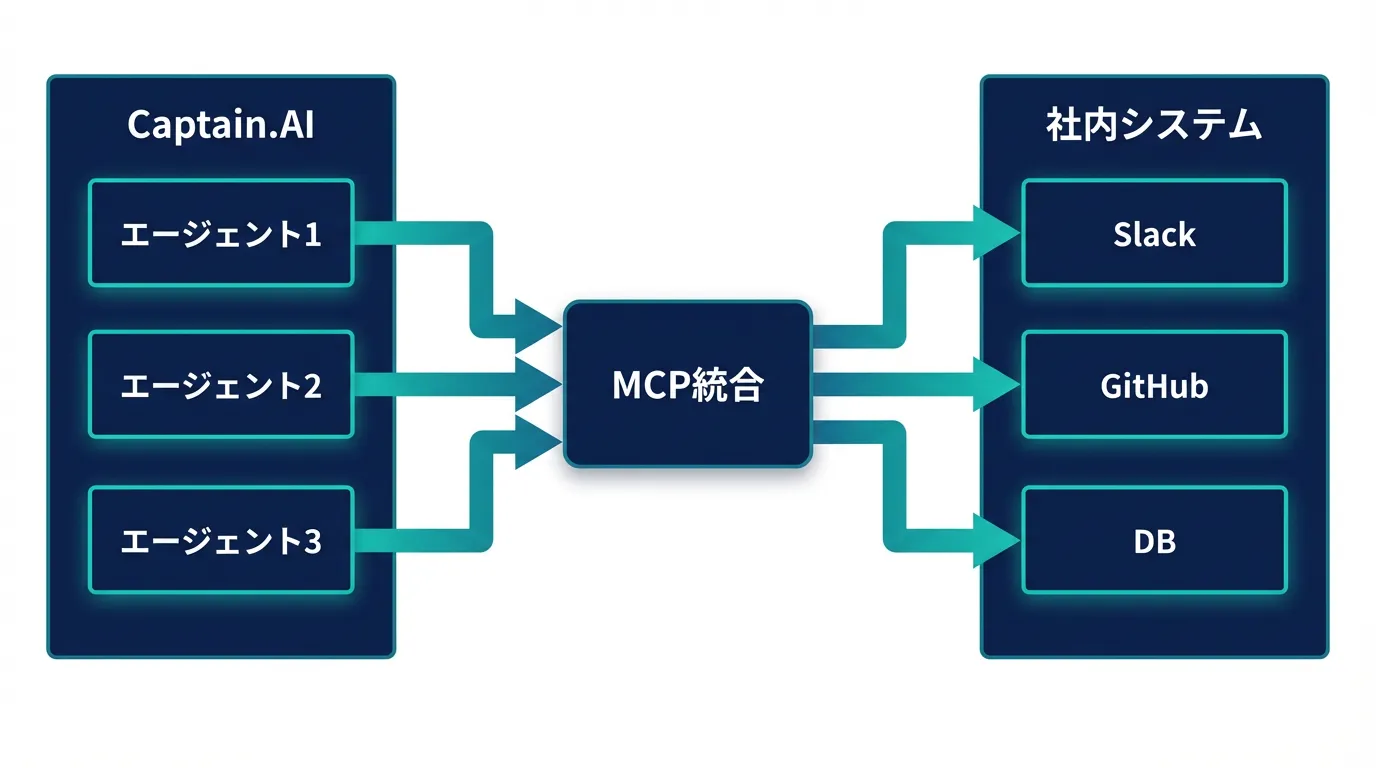 Captain.AIはMCP(Model Context Protocol)に対応しており、社内のSlack、GitHub、データベース等との連携が容易です。