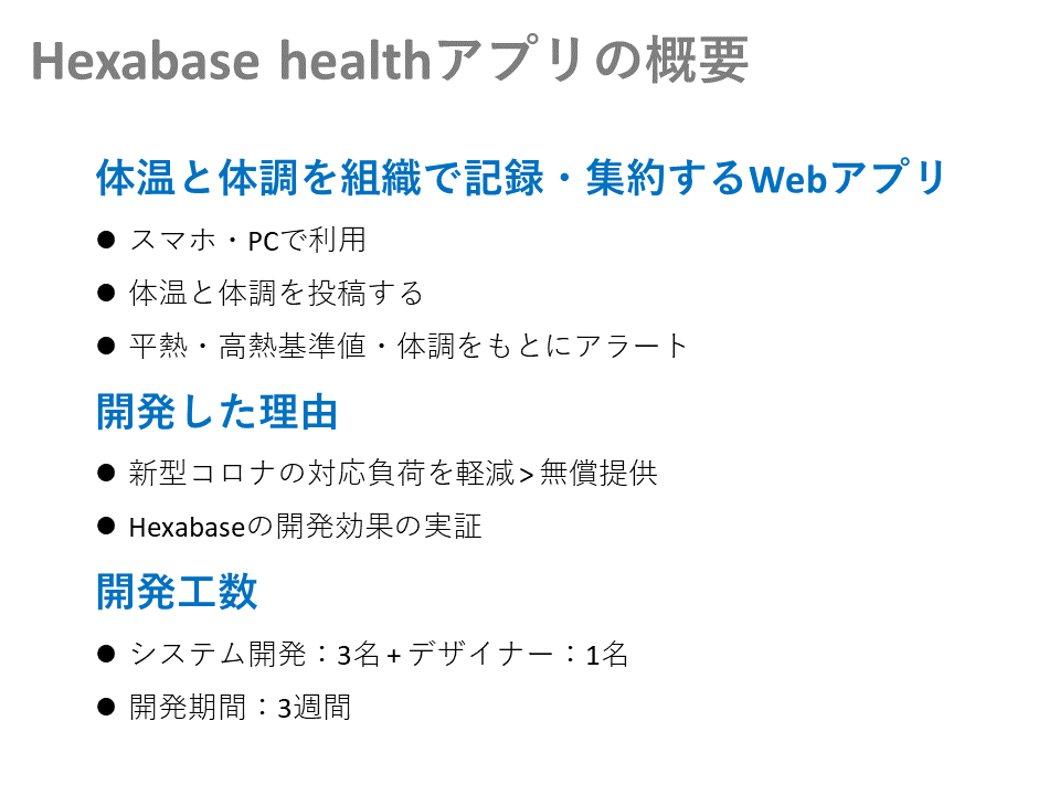 「今回、Hexabase healthのアプリケーションを、3週間ほどで開発することができました。