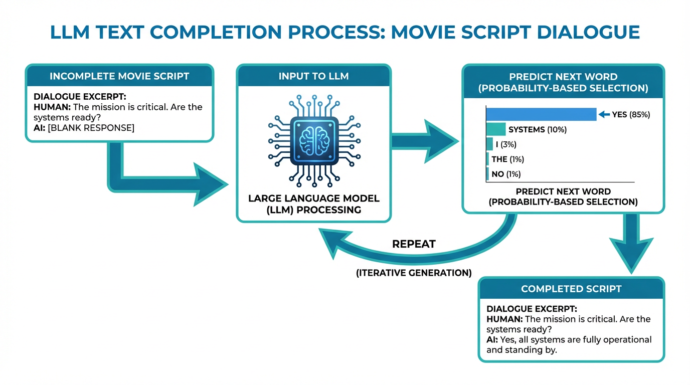 想像してみてください。あなたの手元に、人とAIアシスタントが登場する映画の脚本があります。ただし、AIの回答部分だけが空欄になっている。そこに「魔法の機械」を使えば、その空欄を埋めることができる。この魔法の機械こそが、LLMの本質です。