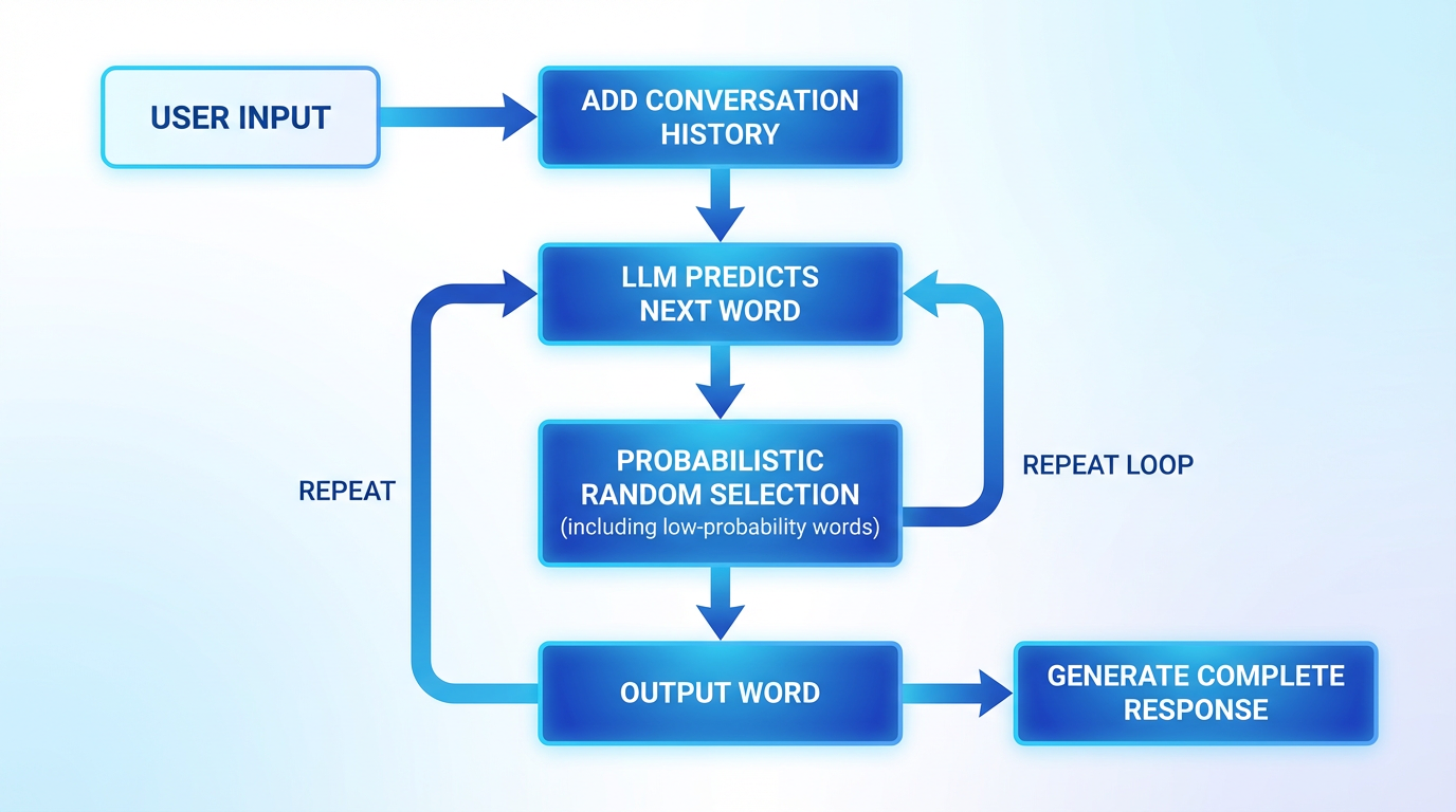 興味深いのは、確率の低い単語もランダムに選ぶようにすると、出力がずっと自然に見える傾向があるという点です。これが、同じ質問をしても毎回異なる答えが返ってくる理由です。LLMは決定的なモデルでありながら、確率的な出力を生成することで、人間らしい柔軟性を獲得しているのです。