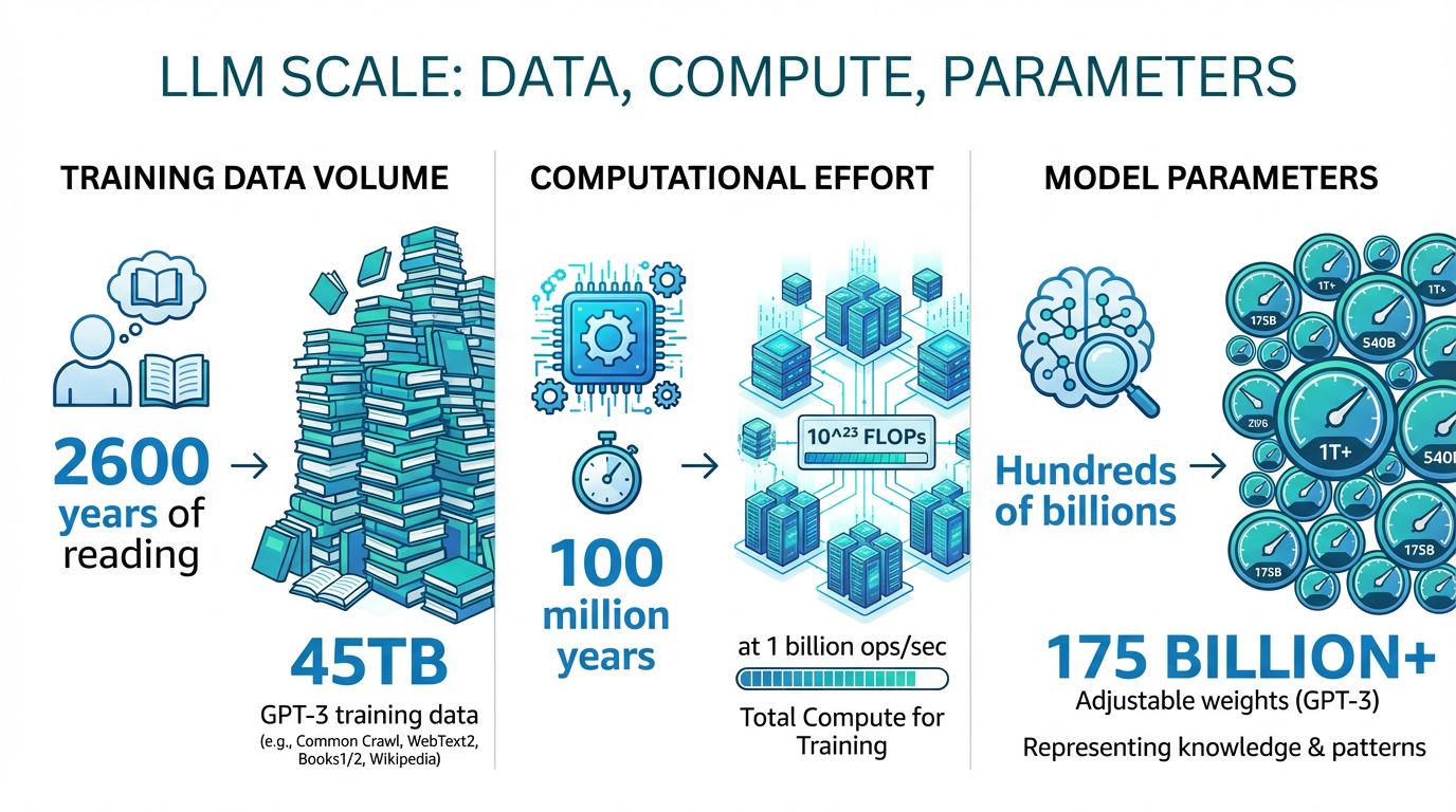 LLMの「賢さ」の秘密は、その圧倒的な規模にあります。