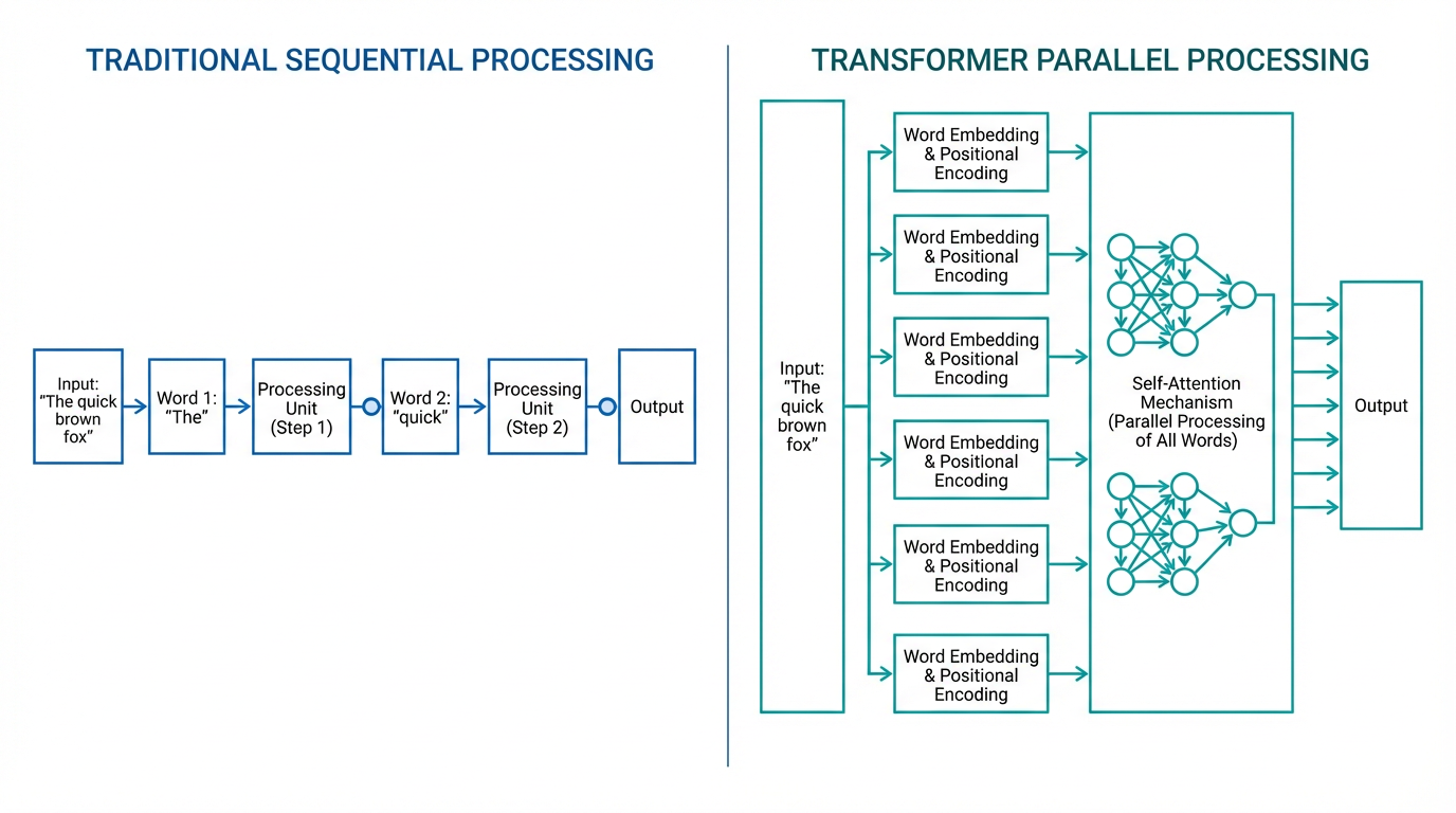 トランスフォーマーは、テキストを最初から最後まで読むのではなく、1度に並行してすべてを取り込みます。この並列処理により、訓練時間が劇的に短縮され、GPUの性能を最大限に活用できるようになりました。