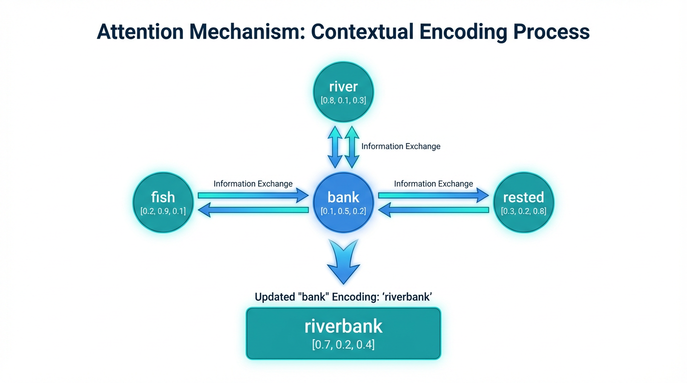 たとえば、「川で魚を釣った。その後、bankに座って休んだ」という文章を考えましょう。最初に「bank」を符号化した数値リストは、周囲の「川」「魚」という単語との情報交換を通じて、「川岸」というより具体的な概念を表すように更新されます。