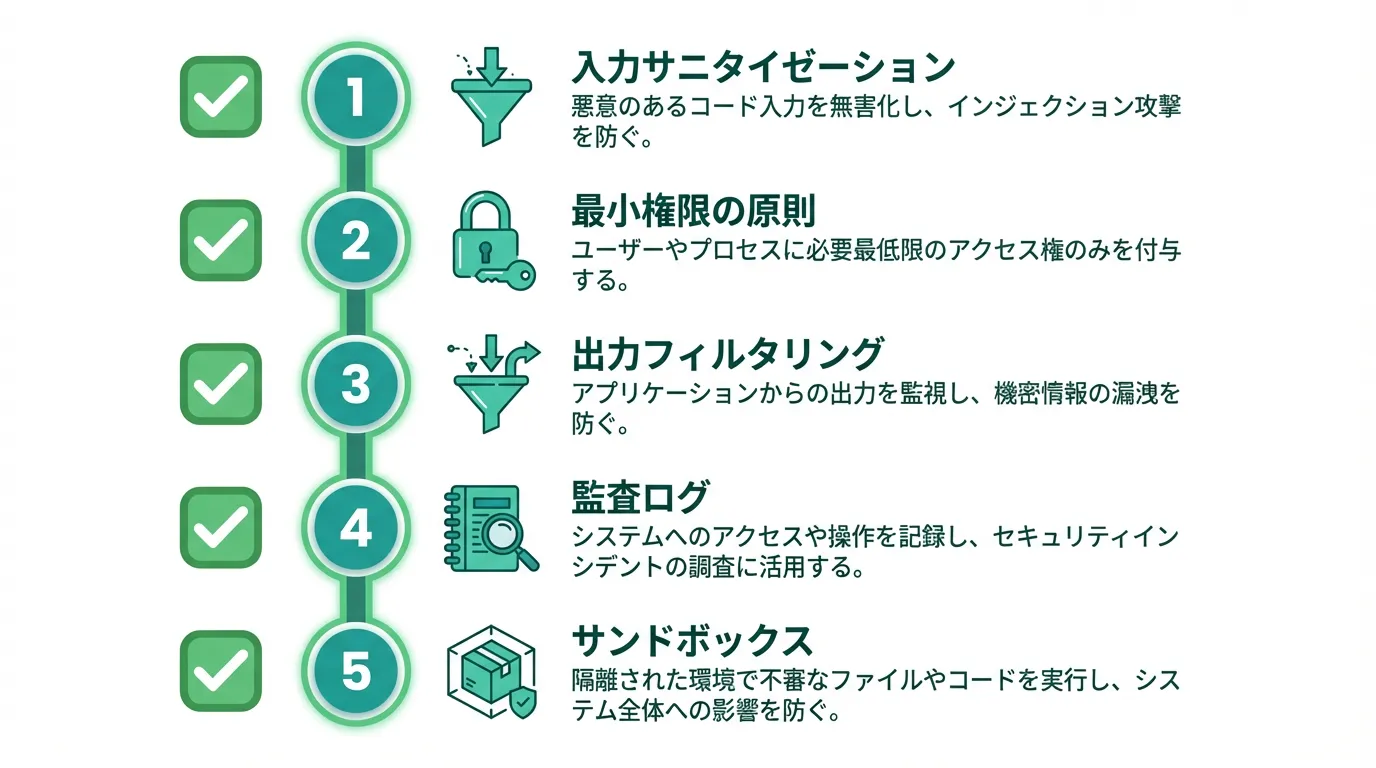 - 今すぐ実装すべき5つの対策: 入力検証、最小権限、出力フィルタリング、監査ログ、サンドボックス