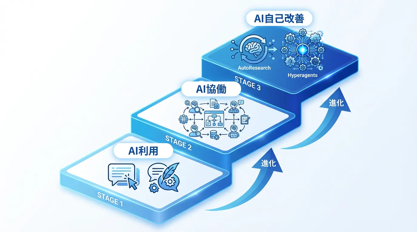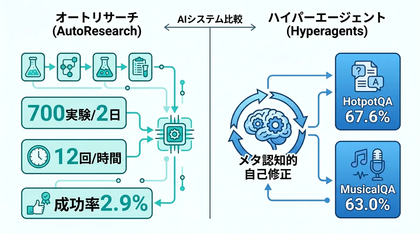 本記事では、2026年3月に立て続けに発表されたAutoResearchとMeta Hyperagentsの2大事例をもとに、自己改善AIエージェントの設計原則を完全解説します。